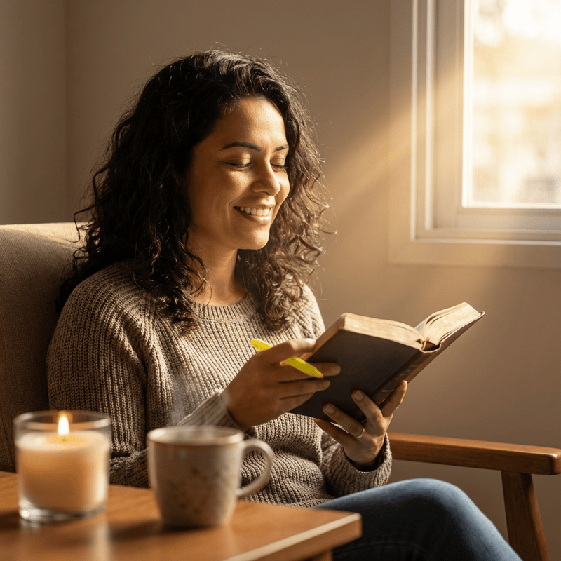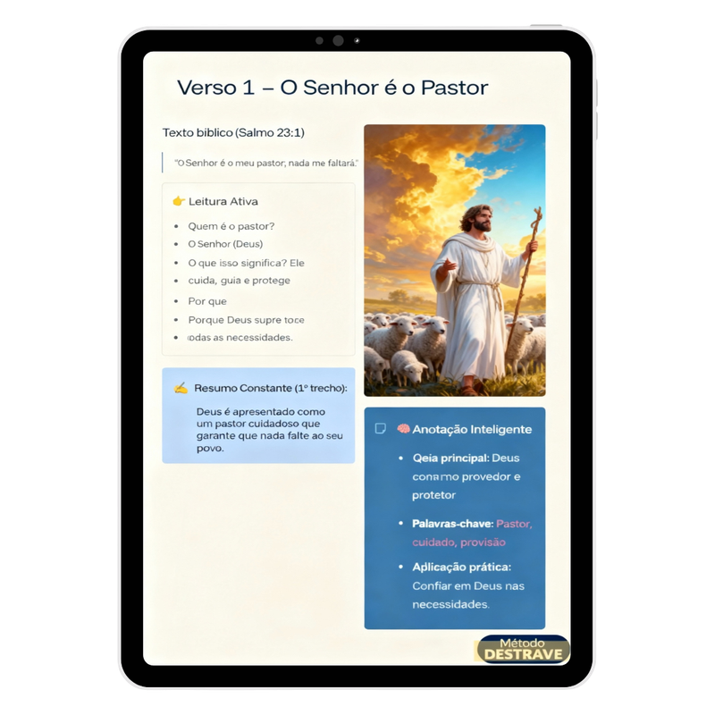 Aprenda a técnica da Leitura Ativa. Em vez de ler palavras isoladas, você aprenderá a enxergar a estrutura do capítulo em segundos. É como ter um GPS dentro da Bíblia.
