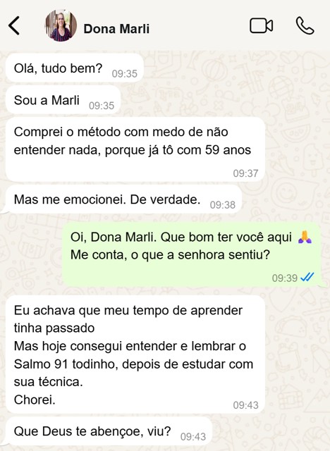 Tenho 62 anos e confesso que comprei com medo. A gente acha que depois de uma certa idade a memória fica fraca, né? Eu lia e esquecia na hora. Mas o irmão Alex explica de um jeito tão simples… Na primeira semana eu apliquei na história de Rute e consegui contar ela inteirinha pro meu esposo no jantar, com detalhes que nem ele lembrava. Chorei de alegria. Nunca é tarde pra guardar a Palavra.